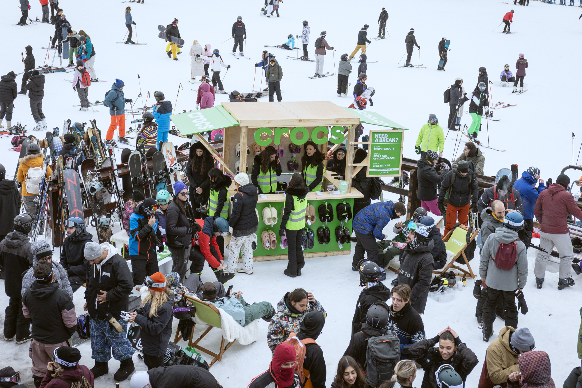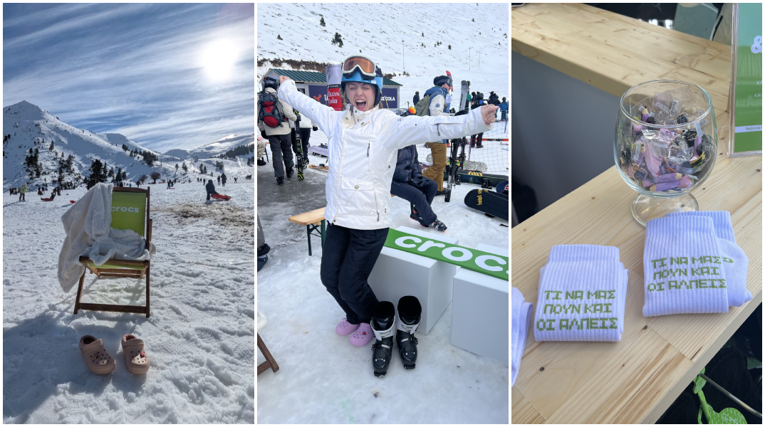 Στο χιονοδρομικό στα Καλάβρυτα, εκεί που τερματίζει η πίστα και ο κόσμος μπορεί να χαλαρώσει, είδαμε skiers και snowboarders να βγάζουν τις μπότες τους, να τις αφήνουν στην άκρη, και να φοράνε Crocs™. Ναι, καλά διάβασες.