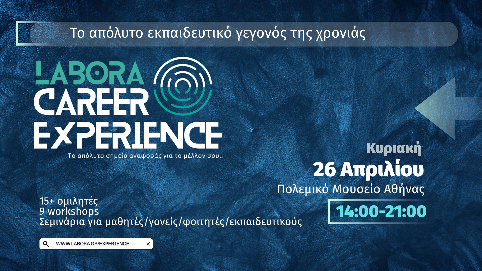 Αυτό ακριβώς είναι το LABORA Career Experience – το μεγαλύτερο συνέδριο επαγγελματικού προσανατολισμού που έχει διοργανωθεί ποτέ στην Ελλάδα, και έρχεται στην Αθήνα στις 26 Απριλίου 2026, στο Πολεμικό Μουσείο, με ώρα έναρξης στις 14:00 και με δωρεάν συμμετοχή για όσους κλείσουν έγκαιρα τη θέση τους.