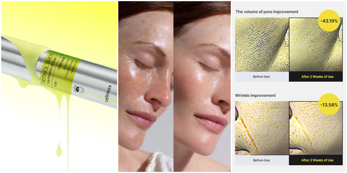 Για ρετινόλη, το Celimax The Vita A Retinol Shot Tightening Serum είναι ένα serum με 0,1% καθαρή ρετινόλη, όχι κάποιο παράγωγο, αλλά η αυθεντική μορφή. Διαθέτει την αποκλειστική τεχνολογία A-Shot™ που διεισδύει 16 φορές βαθύτερα στους πόρους, ενώ περιέχει και 9 διαφορετικά πεπτίδια για επιπλέον σύσφιξη και ελαστικότητα. Τα κλινικά αποτελέσματα μιλάνε από μόνα τους: μείωση πόρων έως 43,91% σε μόλις 2 εβδομάδες.